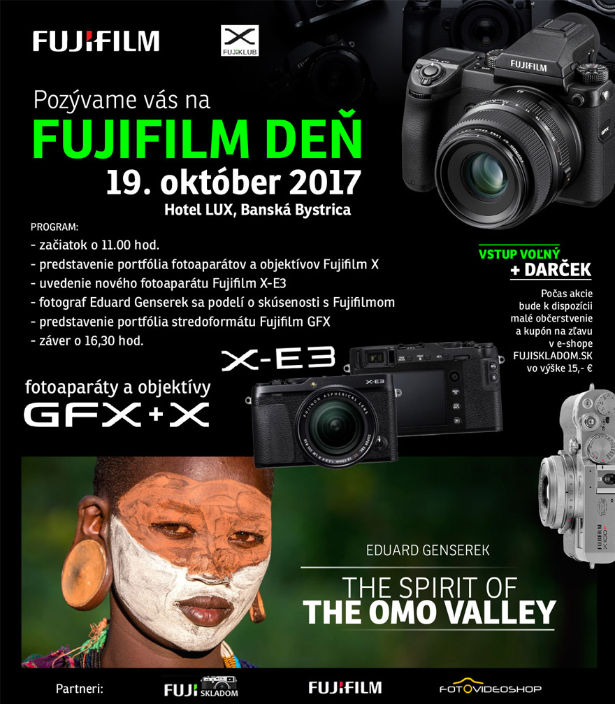 Pozývame Vás na Deň s Fujifilmom, ktorý sa uskutoční 19.10.2017 v hoteli LUX v Banskej Bystrici. Budete mať možnosť vyskúšať si kompletnú produktovú radu Fujifilm fotoaparátov a objektívov, vrátane stredoformátu GFX. Predstavený bude aj nový model X-E3. Hosťom programu bude profesionálny fotograf Ediard Genserek, ktorý sa s vami podelí o svoje skúsenosti s Fujifilmom v praxi...