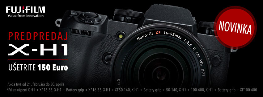 Zákazníci, ktorí si chcu zakúpiť, alebo záväzne objednať v čase od 21.2. do 30.4.2018 telo Fujifilm X-H1 + jeden z objektivov (viď sety nižšie), dostanú od Vas okamžitú zľavu 150,- Euro.