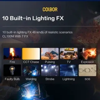 COLBOR CL100X ponúka 10 svetelných režimov a 46 typov živých špeciálnych efektov Fire, CCT Chase, Pulsing, TV, Explosion atď.,