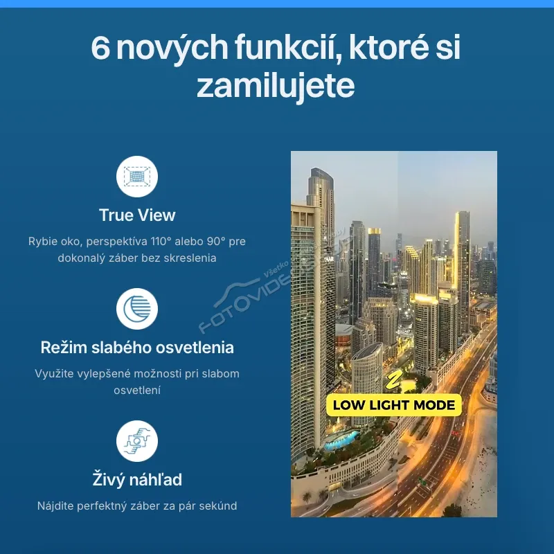 - Vďaka funkcii True View si môžete vybrať medzi ultraširokým 120° fisheye, 110° širokým uhlom bez skreslenia alebo 90° výrezom pre dôležité detaily – ideálne pre rôzne typy projektov.