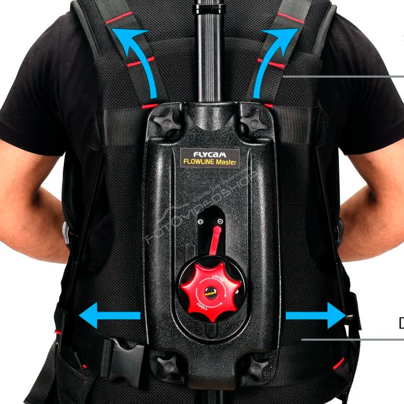 Flycam Flowline Master profesionálne redistribuuje hmotnosť vášho zariadenia z ramien a krku rovnomerne po celom chrbte pomocou ergonomického systému popruhov, čo vám umožní nakrúcať hodiny bez únavy.
