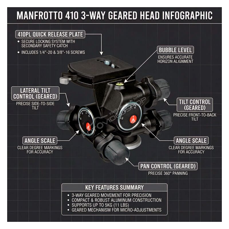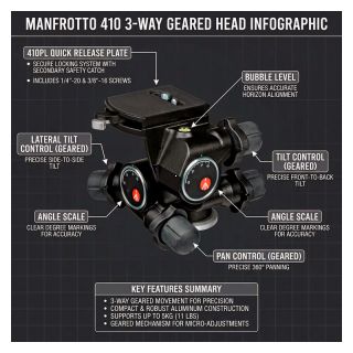 Trojcestná veľmi kompaktná prevodovaná foto hlava Manfrotto 410 Junior Geared Tripod Head, vhodná pre fotoaparáty do hmotnosti 5 kg. Hlavnou výhodou hlavy je presnosť, preto je Ideálna pre fotografovanie makrozáberov, krajiny, architektúry, jedla a pod.