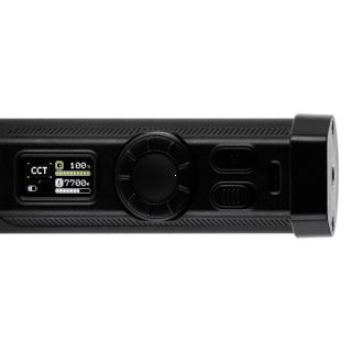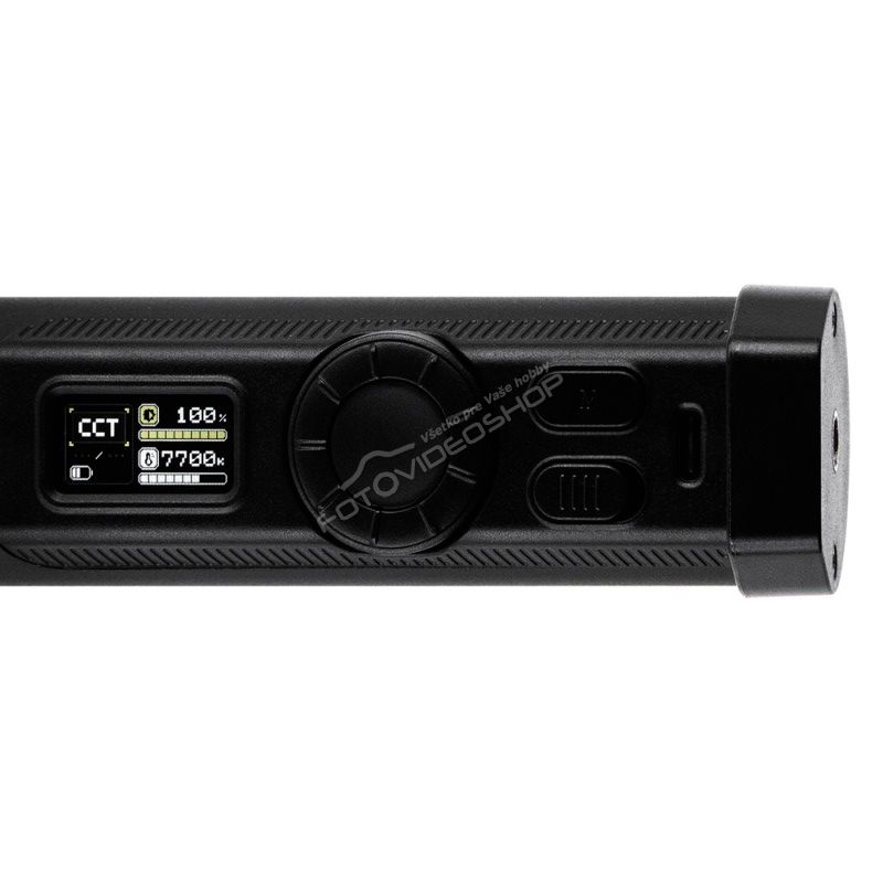 - V hornej časti trubice sa nachádza prehľadný farebný TFT displej, prepínač a funkčné tlačidlo Mode na rýchle prepínanie medzi režimami CCT, HSI a EFF, doplnené širokým otočným ovládačom na presné nastavenie teploty, farby alebo výkonu