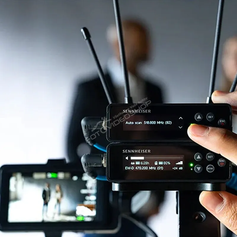 - Bohaté príslušenstvo v balení vrátane kamerového prijímača EK-ewDP, kapesného vysielača SK-ewD, klopového mikrofónu ME 2, magnetického držiaka, akumulátora BA 70, dvoch AA batérií a všetkých potrebných káblov znamená, že môžete začať pracovať ihneď po vybalení