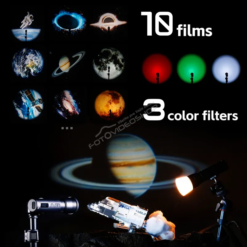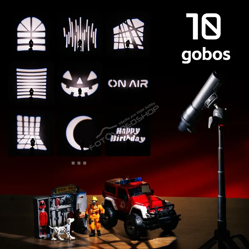 - Súčasťou balenia je difuzér, klapky, snoot, spotlight, 10 gobos, 10 kreatívnych filmových fólií a 3 RGB gely, čo je kompletný arzenál pre tvarovanie svetla.