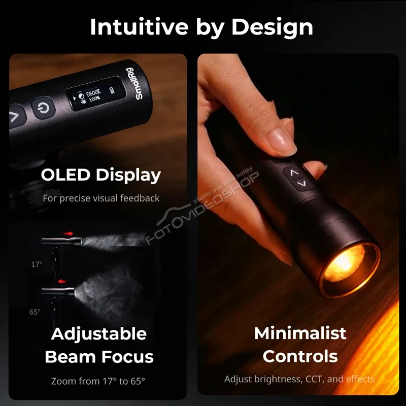 - Jasný OLED displej zobrazuje všetky dôležité informácie vrátane jasu, farebnej teploty a stavu batérie na jednom mieste, takže máte vždy prehľad o nastaveniach bez nutnosti odhadovať.
