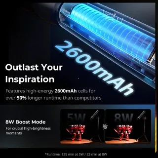 - Vstavaná batéria s kapacitou 2600 mAh poskytuje až 125 minút prevádzky pri výkone 5W v režime nízkého jasu, čo je viac než dosť pre väčšinu natáčacích situácií.