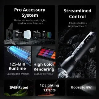 - Plná RGB kontrola farieb otvára neobmedzené možnosti kreatívneho osvetlenia, od jemných farebných nádychov až po výrazné farebné efekty pre hudební videá alebo kreatívne projekty.
