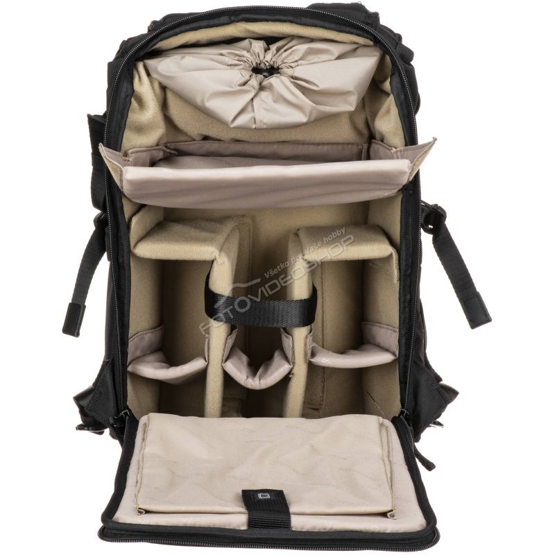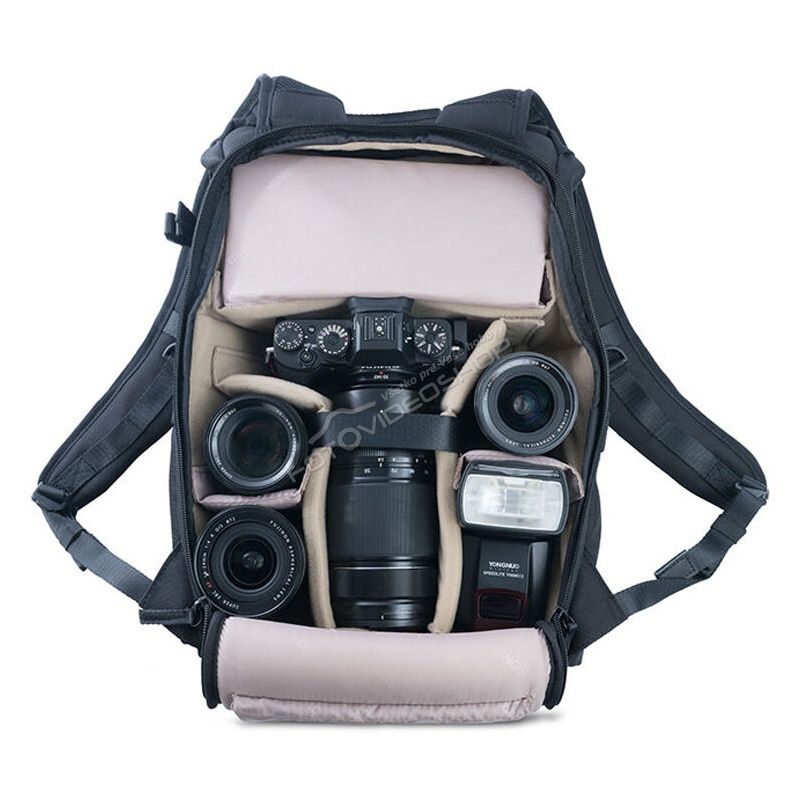 - Vnútro batohu je vybavené mäkkými, polstrovanými deličmi, ktoré si môžete prispôsobiť podľa potreby – bezpečne uskladníte DSLR alebo bezzrkadlovku, až tri objektívy, blesk a ďalšie príslušenstvo.