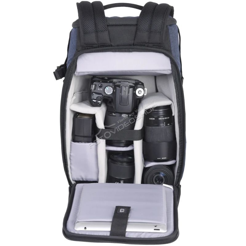 - Okrem fotografickej techniky pohodlne uloží aj blesk, príslušenstvo, 10" tablet, peňaženku, telefón a dokonca aj fľašu s vodou či cestovný statív.